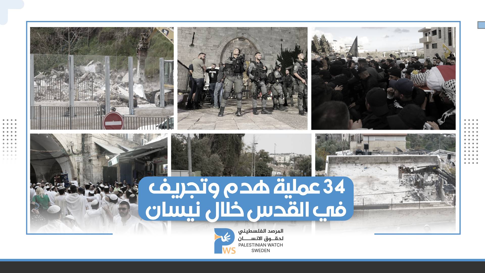 نفذّت سلطات الاحتلال (34) عملية هدم وتجريف، شملت (5) عملية هدم ذاتي قسري أُجبر خلالها المقدسيون على هدم منازلهم لتفادي الغرامات، و(25) عملية هدم نفذتها آليات الاحتلال بالقوة، إضافةً إلى (4) عمليات تجريف، استهدفت أراضٍ وشوارع فلسطينية، بحجة البناء غير المرخص، في وقتٍ تفرض فيه القيود المشددة على الحصول على تراخيص بناء، ما يجعلها شبه مستحيلة للمقدسيين.