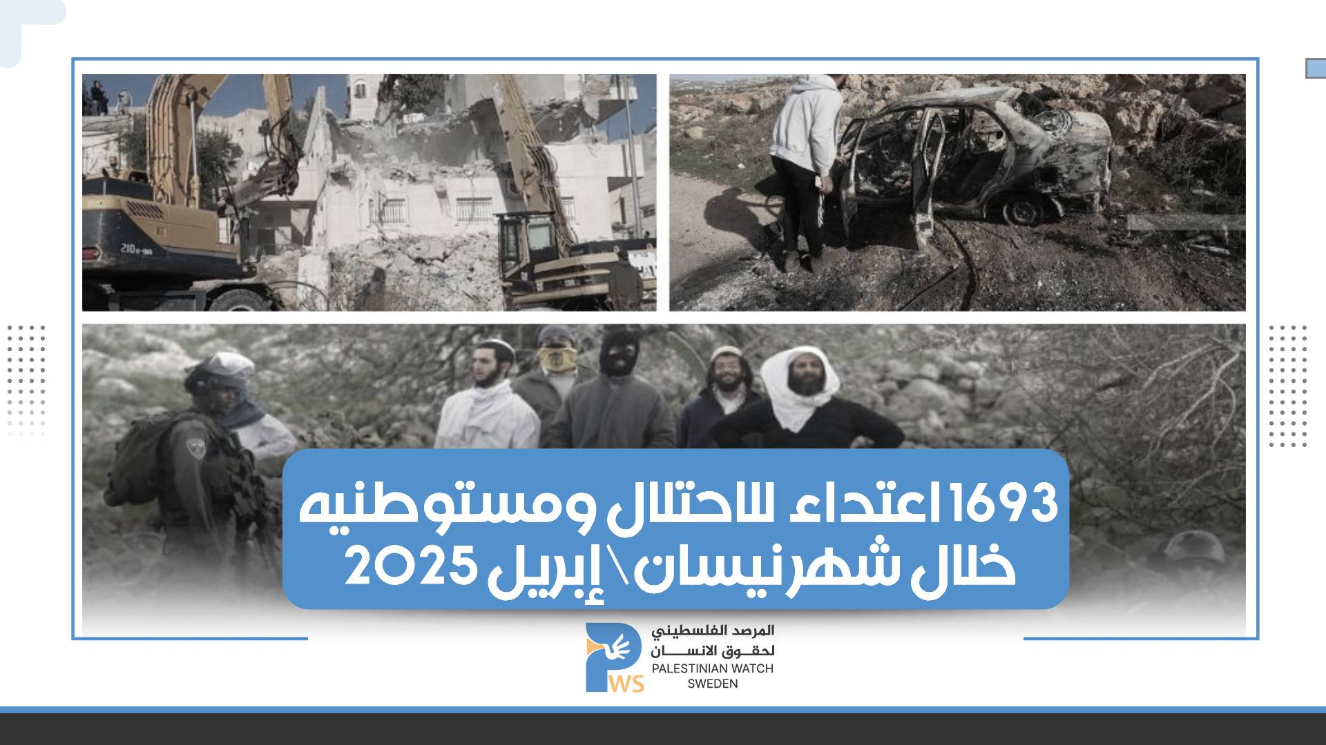 نفذت قوات الاحتلال الإسرائيلي والمستوطنين ما مجموعه 1693 اعتداء، خلال نيسان الماضي، في استمرار لمسلسل الإرهاب المتواصل من قبل دولة الاحتلال ضد الشعب الفلسطيني، وأراضيه، وممتلكاته.
