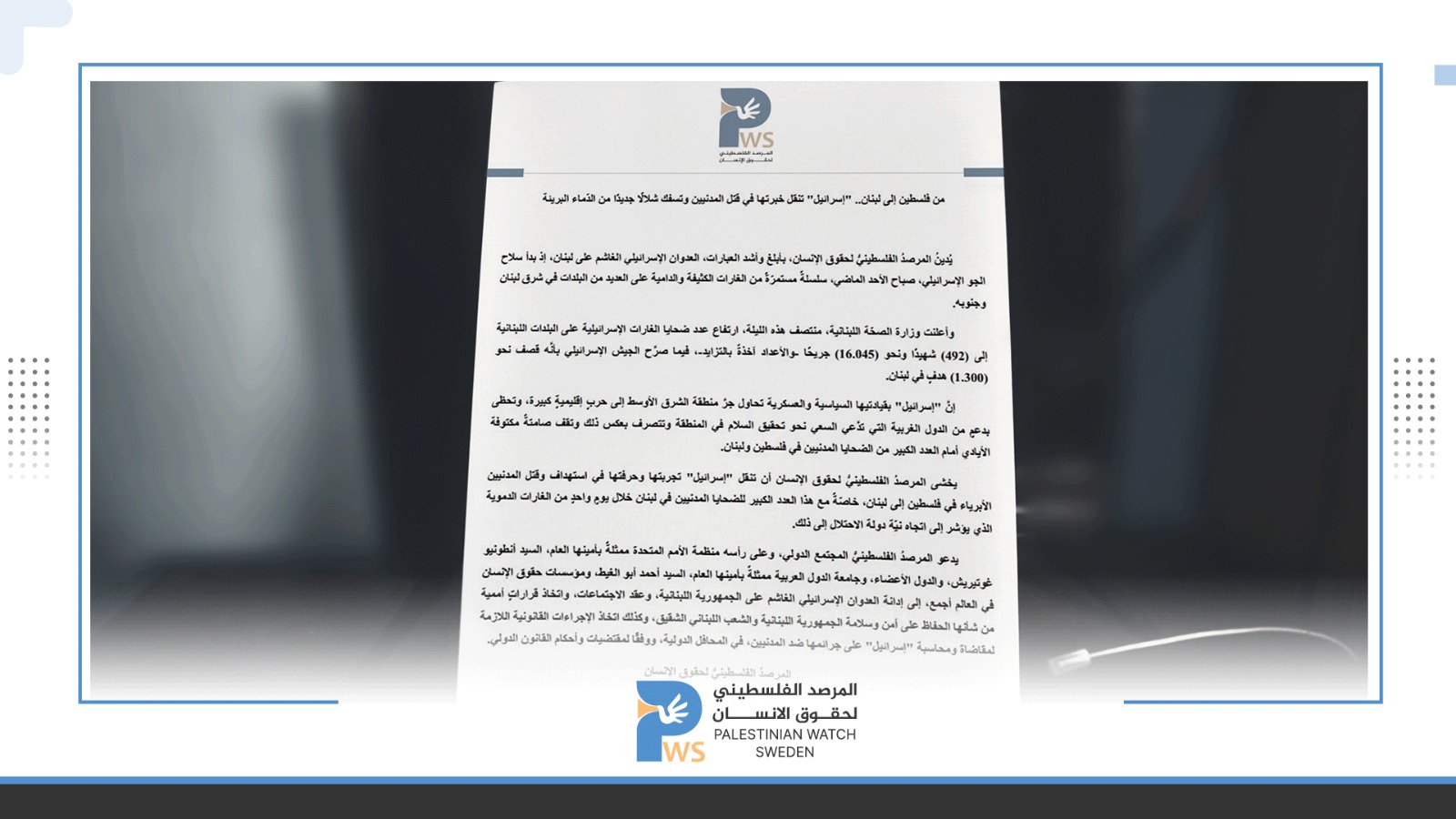 يخشى المرصدُ الفلسطينيُّ لحقوق الإنسان أن تنقل "إسرائيل" تجربتها وحرفتها في استهداف وقتل المدنيين الأبرياء في فلسطين إلى لبنان، خاصّةً مع هذا العدد الكبير للضحايا المدنيين في لبنان خلال يومٍ واحدٍ من الغارات الدموية الذي يؤشر إلى اتجاه نيّة دولة الاحتلال إلى ذلك.